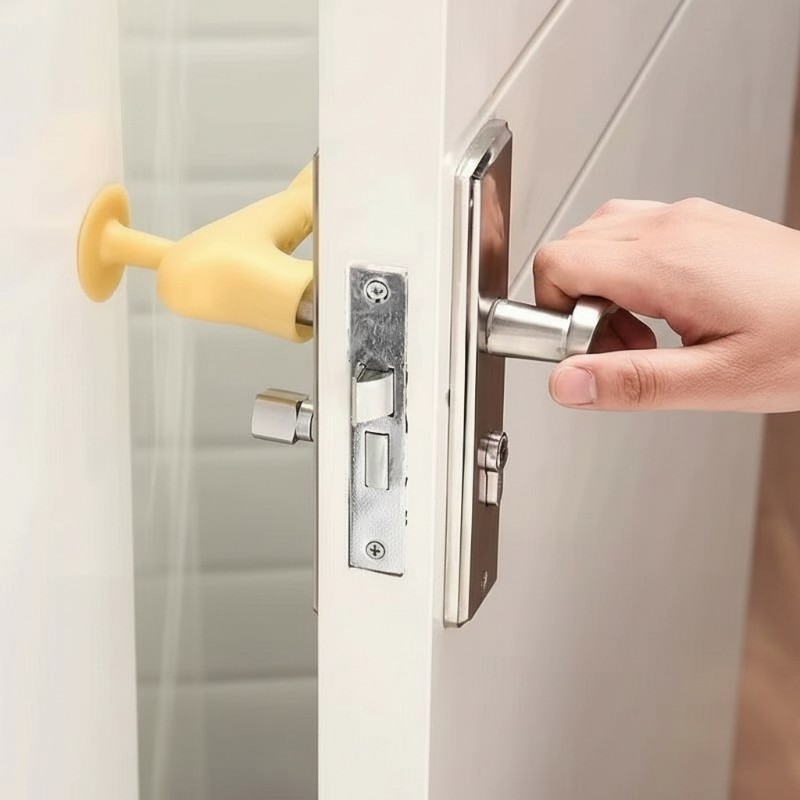 Après : le protecteur absorbe les impacts silencieusement grâce à sa ventouse intelligente et au silicone souple, pour des murs nets et un intérieur apaisé.